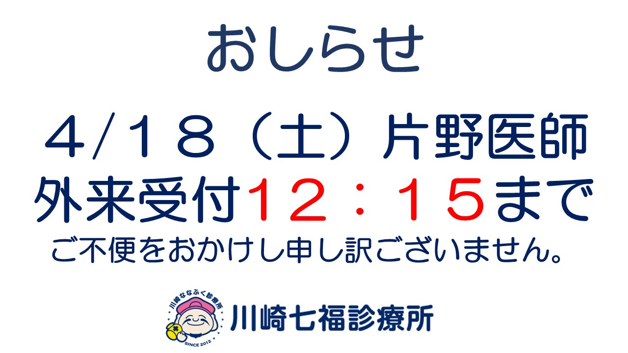 4/18(土)は片野医師の外来受付を12:15に繰り上げます。
